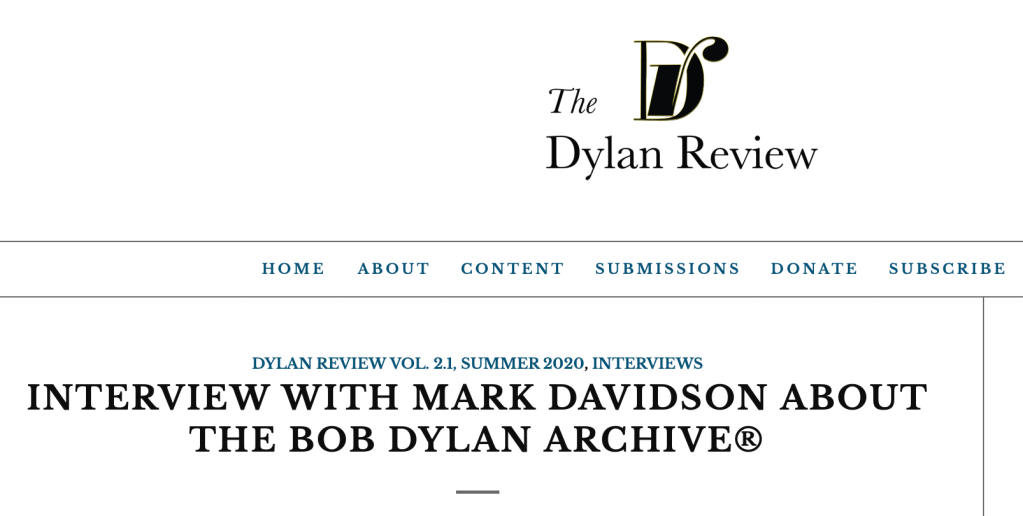 In July, 2020, we released issue 2.2 of the Dylan Review. The issue is full of great analysis of Dylan’s latest album, Rough and Rowdy Ways, and it also contains an interview I conducted with Mark Davidson of the official Dylan Archive in Tulsa, Oklahoma. We range over how Mark arrived in Tulsa, the future of the archive, and even the Tulsa Race Massacre of 1921. Check it out here! (7/15/20)