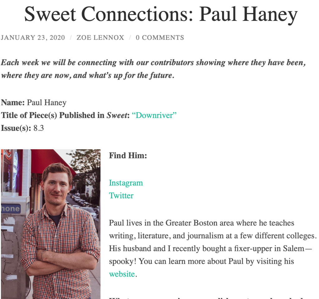 Today Sweet: A Literary Confection, one of my favorite journals, published a brief interview about what I’ve been up to in the few years since they published my flash essay, “Downriver.” And as always, there’s no lack of Bob Dylan. Check it out! (1/23/20)
