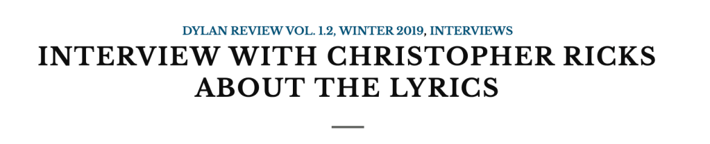In September 2019, I joined this new scholarly online journal, the Dylan Review, as Managing Editor. I guess they liked my ideas (and my edits), because a few weeks later they bumped me up to Co-Editor. All fall the three of us worked with contributors to get their submissions into the best shape possible for our Winter 2019 issue (1.2). Check it out here! I’m especially fond of the interview I conducted with the inimitable Christopher Ricks, which starts on page 65. (12/31/19)
