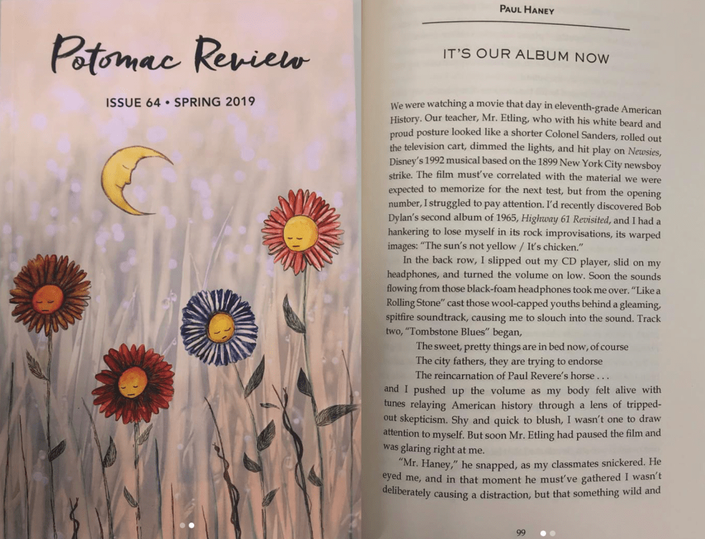 I just received my contributor’s copies of the Potomac Review, issue 64. The essay I have inside, “It’s Our Album Now,” thinks about Dylan’s 1965 tour de force, Highway 61 Revisited, while debating with classic rocker Al Kooper about the validity of biographical readings and recalling my own teenage obsession with the surrealistic rock tunes. (3/29/19)