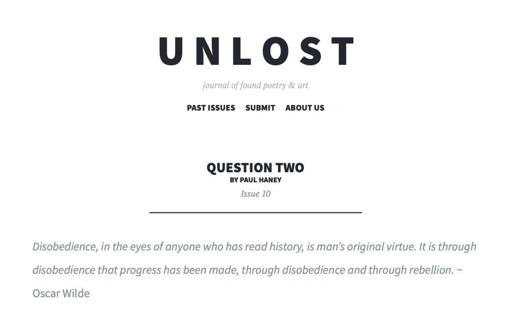 I’m thrilled to have my poem, “Spoils,” featured in the Cincinnati Review miCRo Series today, along with an audio file of me reading it and an incredibly kind introduction by Associate Editor Caitlyn Doyle. She writes, in part, “Haney creates such an echo-rich sonic atmosphere that we’re helpless to resist joining in his revelry. Yet he also subtly spurs us to look beneath the gleaming surfaces that surround us and question their cost.” What a joy for someone to “get” what you’re upto, and to confirm that you got it across. Anyway, check it out! (9/18/18)