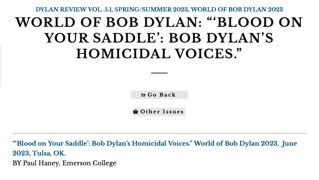 We don’t typically run our own articles in the Dylan Review, but in this case we made an exception as part of a special feature of papers delivered at the 2023 World of Bob Dylan conference in Tulsa, Oklahoma. Throughout his career, Bob Dylan has taunted, threatened, and jeered in song, increasingly so in his later years. Check out my analysis here — or watch it on YouTube! (Thanks to Harrison Hewitt for holding up his phone for the length of my talk!) (7/31/23)